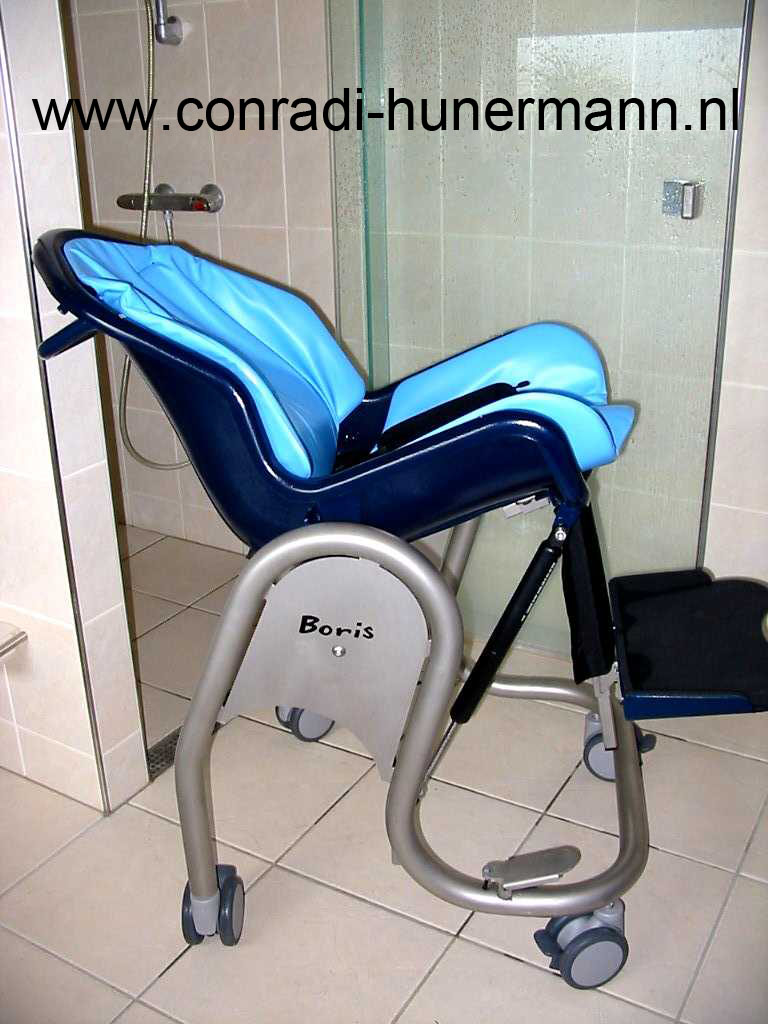 De Boris douche/toiletstoel van Ortec. is een douche/toiletstoel met een kuipstoeltje wat ervoor zorgt dat ik overal ondersteund wordt. Verder heeft de stoel een kantelverstelling en kan hij op verschillende hoogtes gezet worden. De Boris kan makkelijk boven het toilet gereden worden en als dat ergens niet mogelijk is dan zit er ook toiletemmer bij.