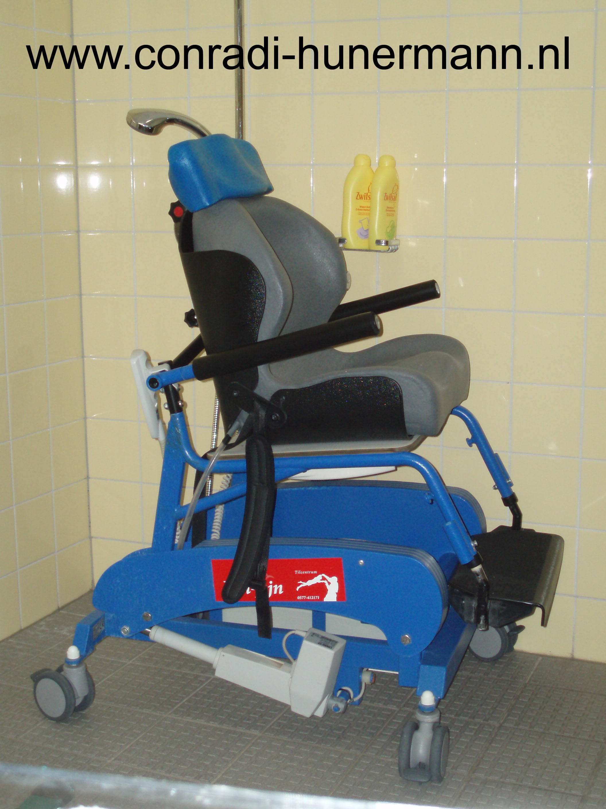 Dit is de Dol-fijn van het Tilcentrum. Dit is een douchestoel die een elektrische hoog/laagfunctie heeft. Als de stoel omhoog gaat dan kantelt hij tergelijkertijd achterover. De hoog/laag functie is erg makkelijk tijdens de verzorging. De ene persoon is namelijk lang en de andere weer weer wat korter. Ze kunnen de stoel op de gewenste hoogte plaatsen.