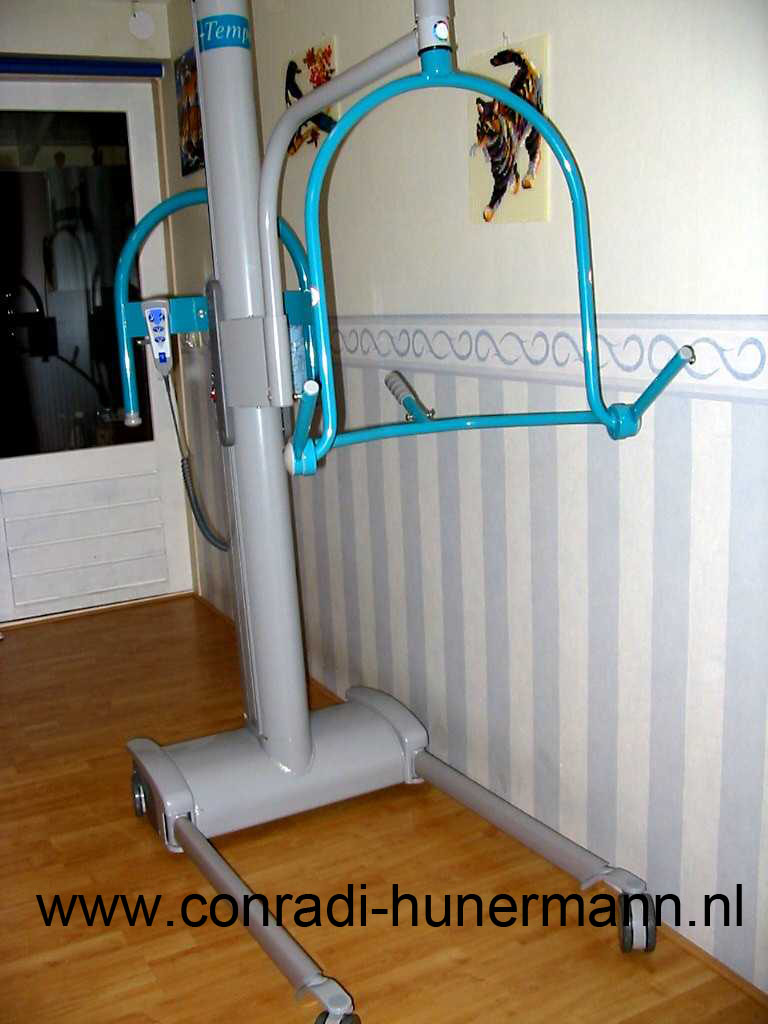 Hier ziet u de Tempo tillift (ARJO) die wij thuis gebruiken. De tillift gebruik ik om vanuit mijn bed in de rolstoel te komen en vice versa of van elektrische rolstoel naar duwrolstoel of toilet/douchestoel. De tillift wordt gebruikt voor bijna alle transfers. De tillift ontziet de ruggen van mijn verzorgers, omdat ze niet meer hoeven te tillen.