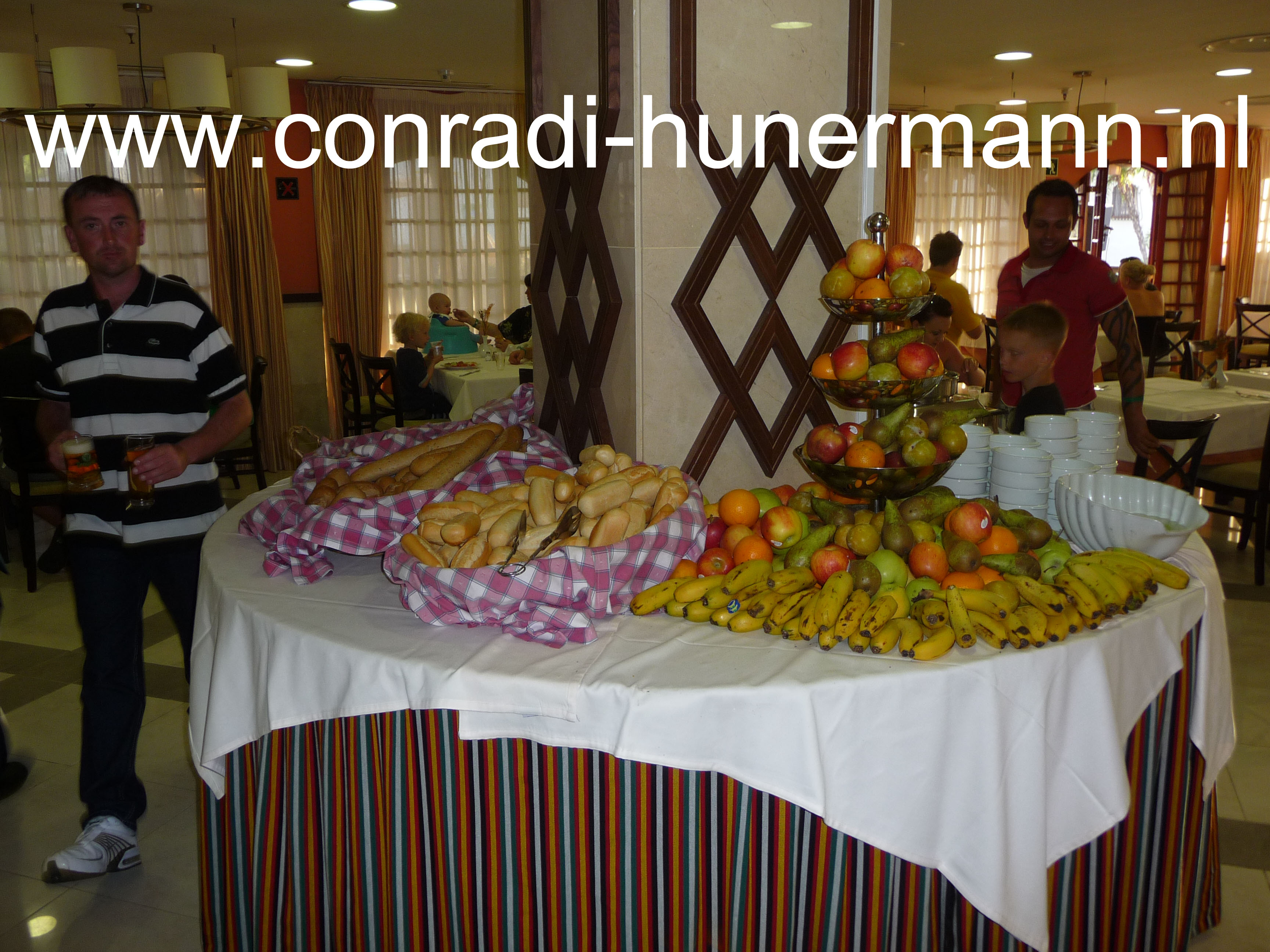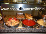Als eten hebben we haan, friet, doperwten en wortelen en stoofpeertjes. Heerlijk. We hebben er met